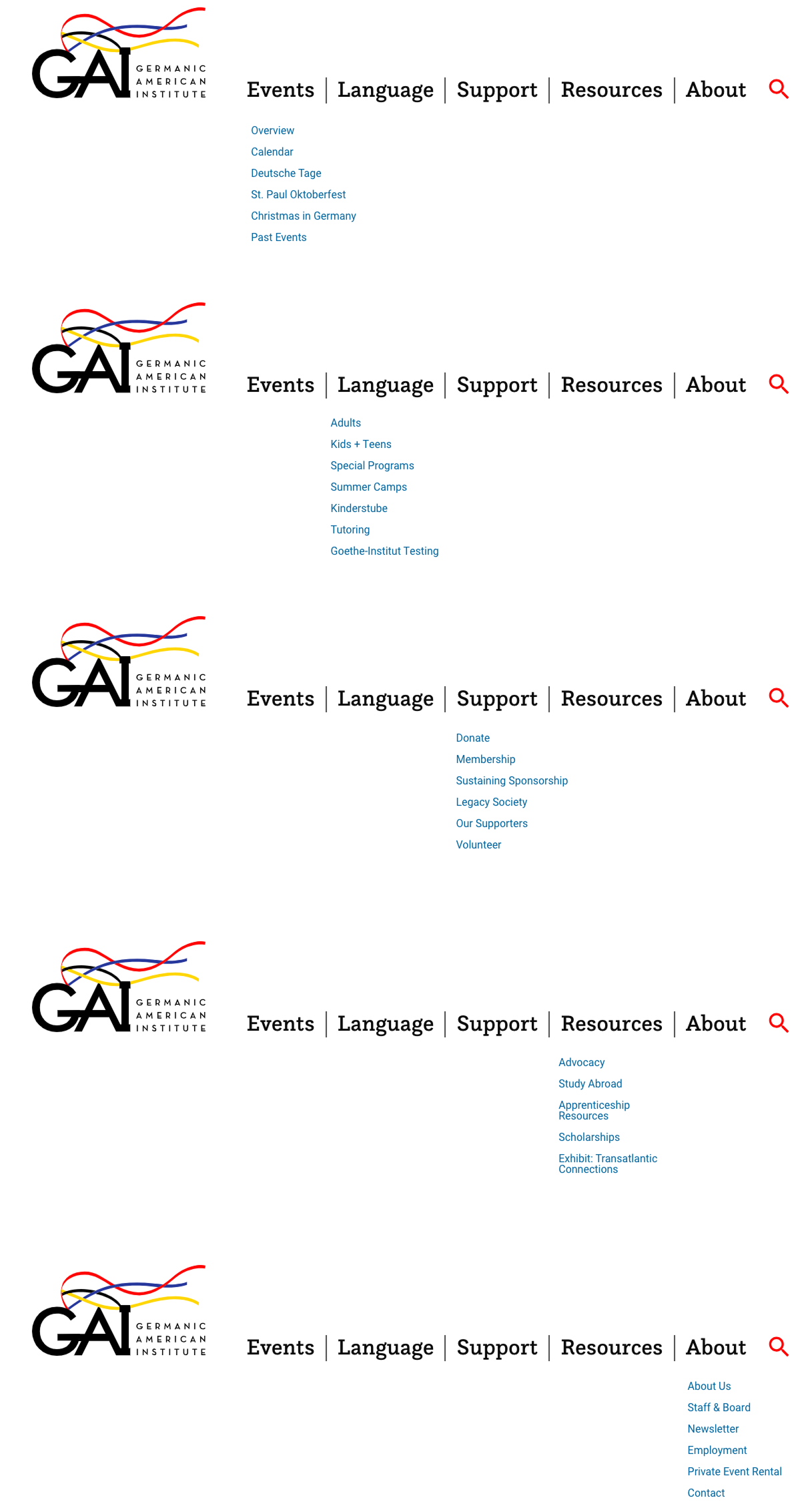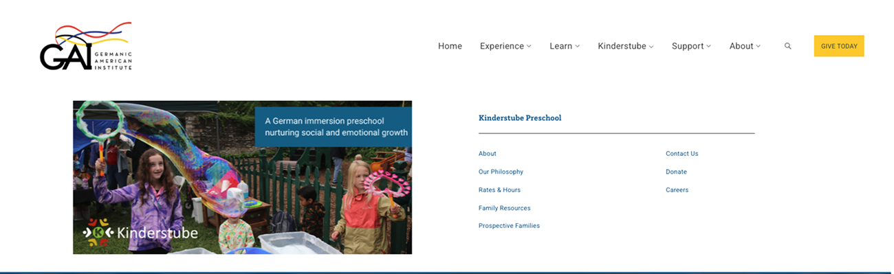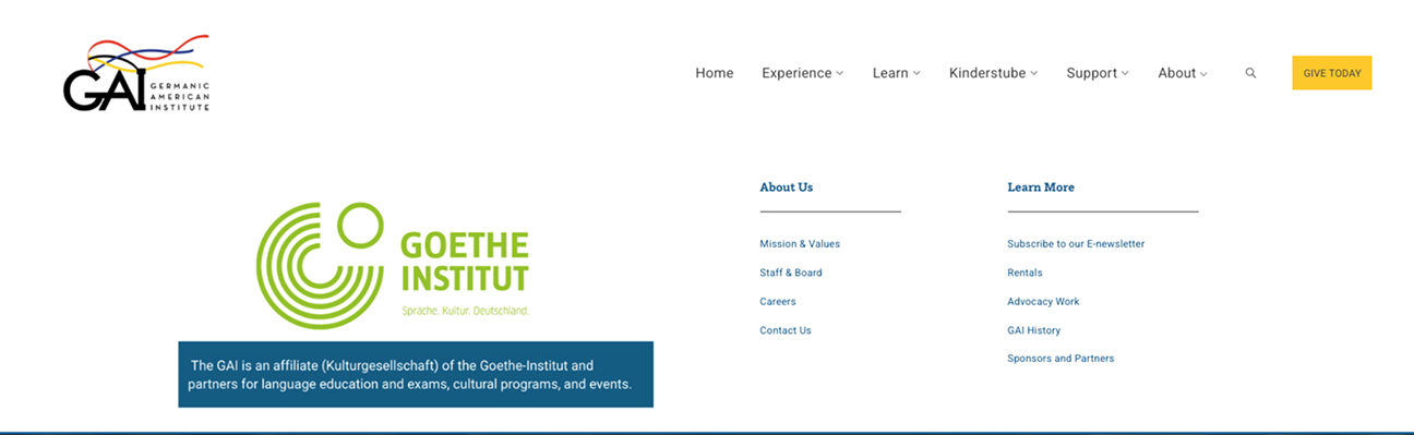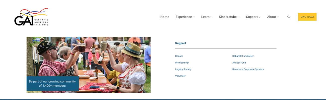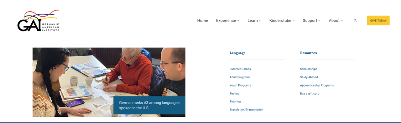 Led a full UX redesign of the Germanic American Institute website, using survey insights and card sorting to replace dropdown-heavy navigation with a structured mega menu that improves program visibility, donation access, and mobile usability.