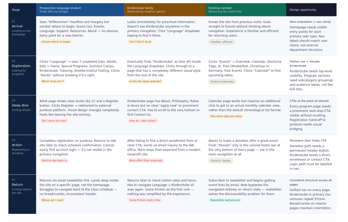 Survey and card sort data revealed that while users valued the GAI's programming and sense of community, the website made it difficult to find key offerings efficiently. Navigation felt unintuitive, with language programs, events, and the preschool buried within dropdowns or disconnected from the main site experience.